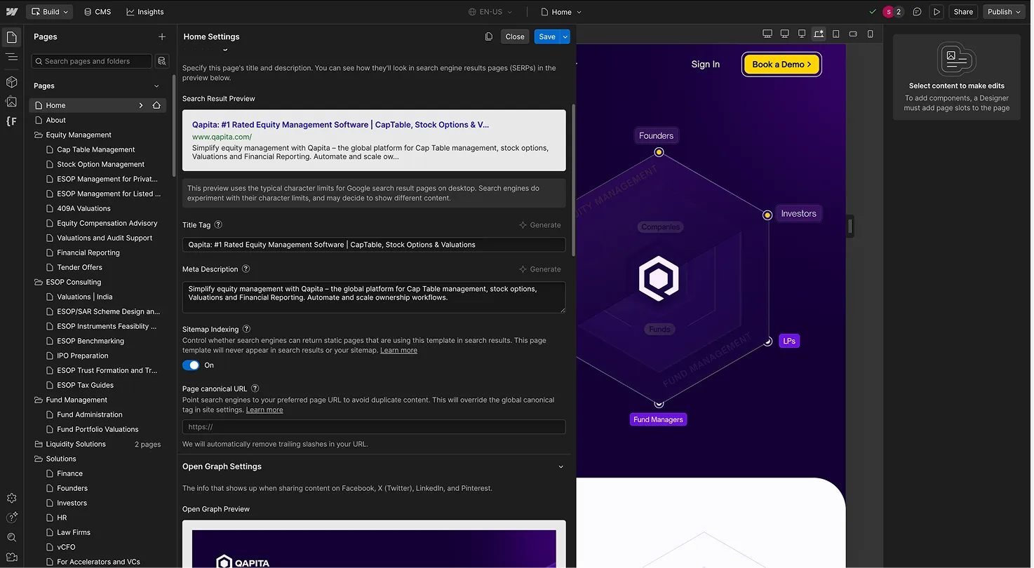 Webflow SEO settings for an individual page.